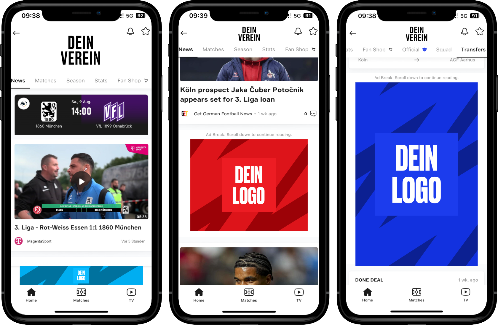 • Ad-Bundle mit großer Reichweite in der OneFootball-App, inkl. Unternehmenslogo und Integration im Umfeld der jeweiligen Vereinsseite in der OneFootball-App